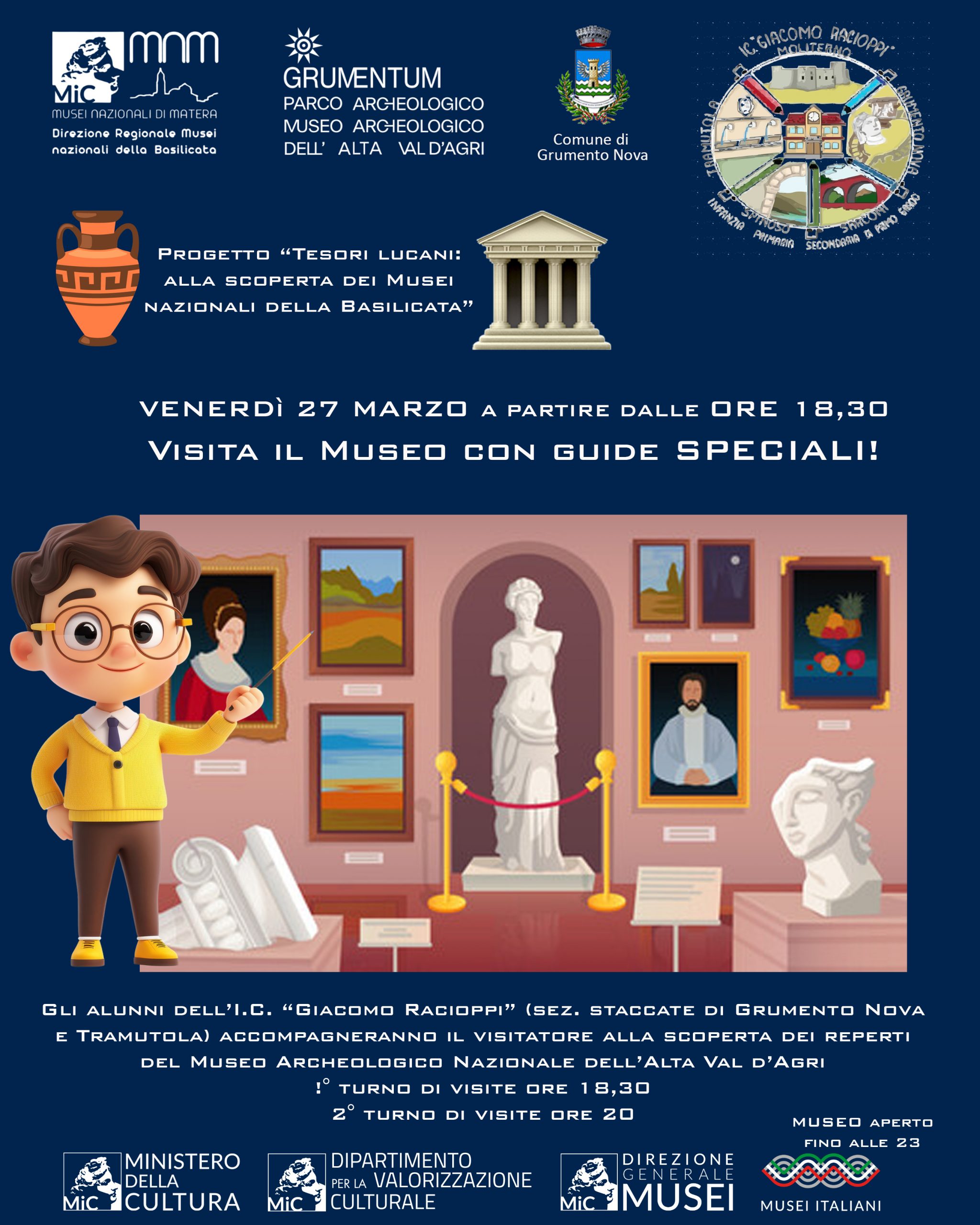 L’evento, dal titolo “Visita il Museo con guide speciali“, in collaborazione con l’Istituto Comprensivo “G. Racioppi” e il Comune di Grumento Nova, prevede la visita alla collezione del Museo a cura degli studenti delle sezioni di Grumento Nova e Tramutola.